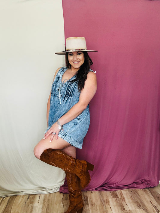 Sold outThe Adelina Chambray Denim Romper